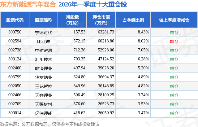 从基金规模来看,东方新能源汽车混合基金2026年一季度公布的基金规模为75.07亿元,较上一期规模87.36亿元变化了-12.29亿元,环比变化了-14.07%。该基金最新一期资产配置为:股票占净值比93.34%,债券占净值比5.67%,现金占净值比0.59%。从基金持仓来看,该基金当季前十大股票仓位达55.43%,第一大重仓股为宁德时代(300750),持仓占比为8.43%。