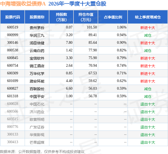 从基金规模来看,中海增强收益债券A基金2026年一季度公布的基金规模为0.05亿元,较上一期规模359.62万元变化了152.46万元,环比变化了42.39%。该基金最新一期资产配置为:股票占净值比11.12%,债券占净值比98.46%,现金占净值比1.52%。从基金持仓来看,该基金当季前十大股票仓位达7.76%,第一大重仓股为贵州茅台(600519),持仓占比为1.06%。