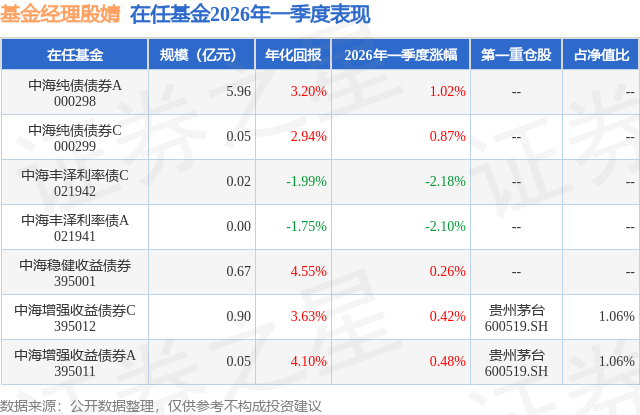 从基金规模来看,中海增强收益债券C基金2026年一季度公布的基金规模为0.9亿元,较上一期规模7621.57万元变化了1420.58万元,环比变化了18.64%。该基金最新一期资产配置为:股票占净值比11.12%,债券占净值比98.46%,现金占净值比1.52%。从基金持仓来看,该基金当季前十大股票仓位达7.76%,第一大重仓股为贵州茅台(600519),持仓占比为1.06%。