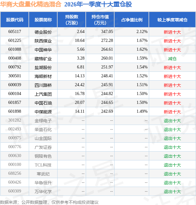 从基金规模来看,华商大盘量化精选混合基金2026年一季度公布的基金规模为1.63亿元,较上一期规模1.78亿元变化了-1472.69万元,环比变化了-8.27%。该基金最新一期资产配置为:股票占净值比92.78%,无债券类资产,现金占净值比7.33%。从基金持仓来看,该基金当季前十大股票仓位达16.06%,第一大重仓股为德业股份(605117),持仓占比为2.12%。