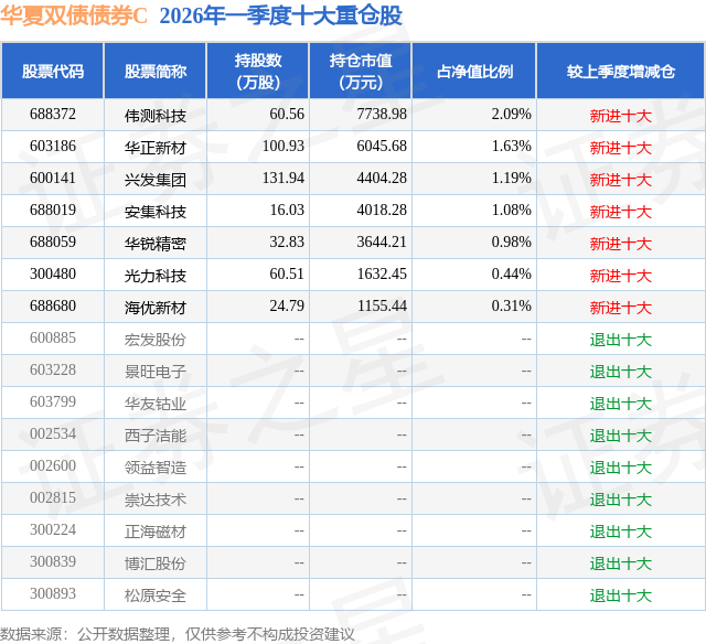 从基金规模来看,华夏双债债券C基金2026年一季度公布的基金规模为7.92亿元,较上一期规模2.59亿元变化了5.32亿元,环比变化了205.04%。该基金最新一期资产配置为:股票占净值比7.72%,债券占净值比89.93%,现金占净值比1.66%。从基金持仓来看,该基金当季前十大股票仓位达7.72%,第一大重仓股为伟测科技(688372),持仓占比为2.09%。