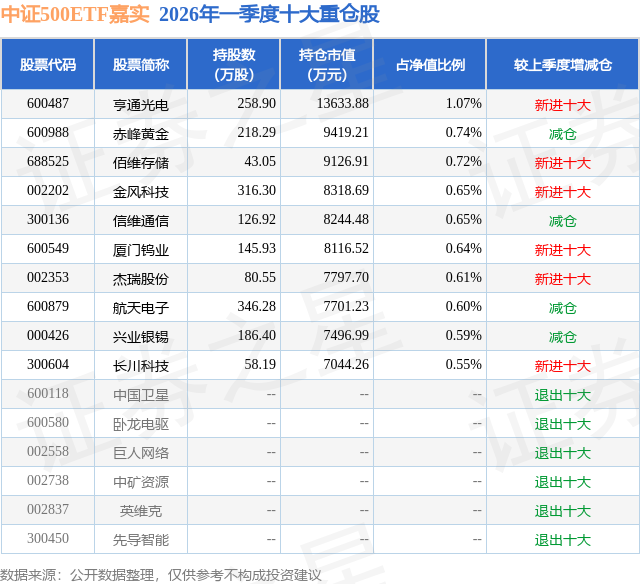 从基金规模来看,中证500ETF嘉实基金2026年一季度公布的基金规模为127.48亿元,较上一期规模156.15亿元变化了-28.68亿元,环比变化了-18.36%。该基金最新一期资产配置为:股票占净值比98.78%,无债券类资产,现金占净值比1.14%。从基金持仓来看,该基金当季前十大股票仓位达6.82%,第一大重仓股为亨通光电(600487),持仓占比为1.07%。