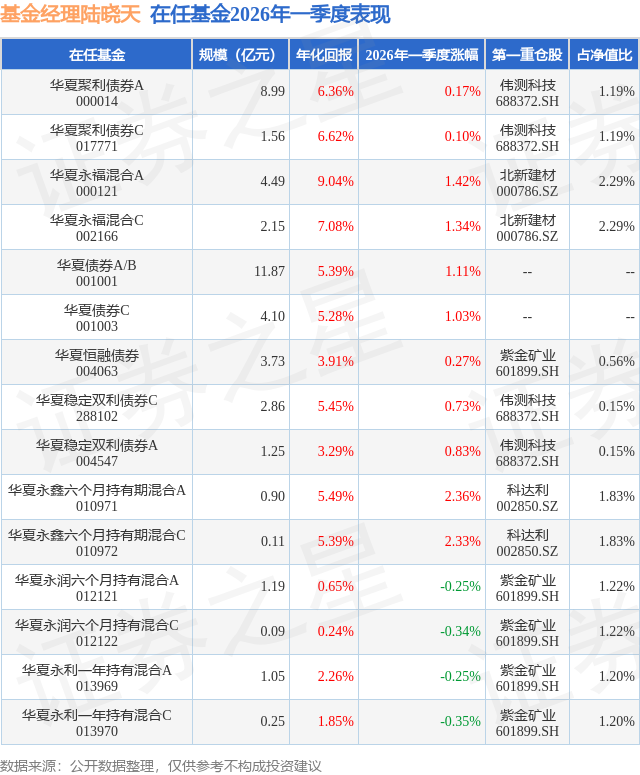 华夏永福混合A现任基金经理为陆晓天,本季度增聘基金经理陆晓天,近期离任的基金经理为何家琪。其中在任基金经理陆晓天已从业0年又328天,2026年1月26日正式接手管理华夏永福混合A,任职期间累计回报为-2.0%。目前还管理着15只基金产品(包括A类和C类),其中本季度表现最佳的基金为华夏永鑫六个月持有期混合A(010971),季度净值涨幅为2.36%。