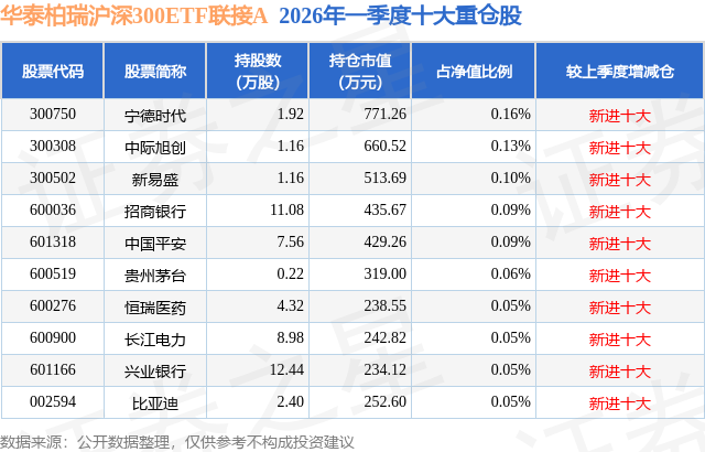 从基金规模来看,华泰柏瑞沪深300ETF联接A基金2026年一季度公布的基金规模为18.03亿元,较上一期规模11.29亿元变化了6.74亿元,环比变化了59.7%。该基金最新一期资产配置为:股票占净值比2.96%,无债券类资产,现金占净值比6.94%。从基金持仓来看,该基金当季前十大股票仓位达0.83%,第一大重仓股为宁德时代(300750),持仓占比为0.16%。