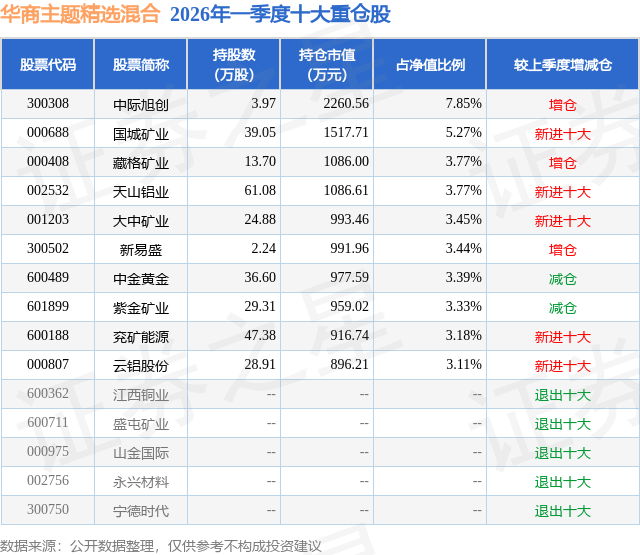 从基金规模来看,华商主题精选混合基金2026年一季度公布的基金规模为2.88亿元,较上一期规模2.63亿元变化了2533.09万元,环比变化了9.64%。该基金最新一期资产配置为:股票占净值比92.6%,无债券类资产,现金占净值比7.96%。从基金持仓来看,该基金当季前十大股票仓位达40.56%,第一大重仓股为中际旭创(300308),持仓占比为7.85%。