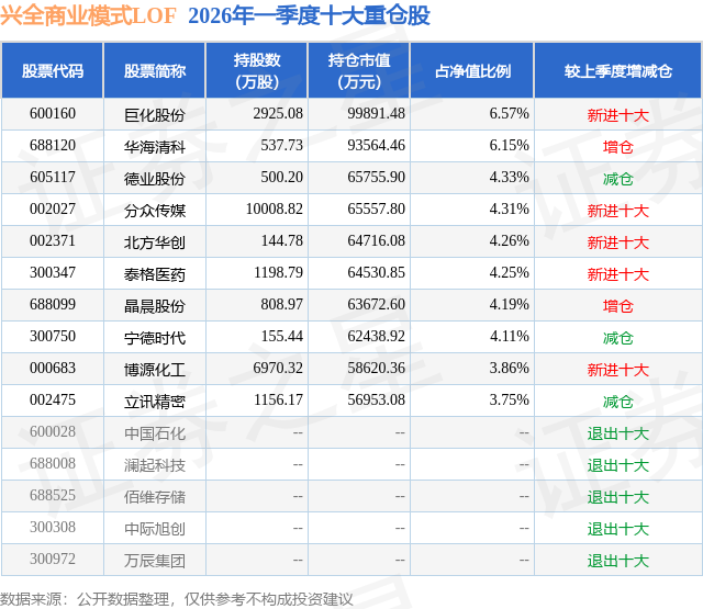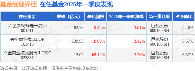 证券之星消息,日前兴全商业模式LOF基金公布一季报,2026年一季度最新规模139.93亿元,季度净值涨幅为3.42%。