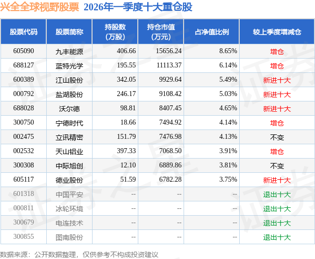 从基金规模来看,兴全全球视野股票基金2026年一季度公布的基金规模为18.09亿元,较上一期规模12.75亿元变化了5.35亿元,环比变化了41.96%。该基金最新一期资产配置为:股票占净值比92.64%,债券占净值比3.93%,现金占净值比3.96%。从基金持仓来看,该基金当季前十大股票仓位达49.7%,第一大重仓股为九丰能源(605090),持仓占比为8.65%。