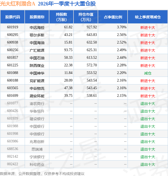 从基金规模来看,光大红利混合A基金2026年一季度公布的基金规模为2.51亿元,较上一期规模3.11亿元变化了-5976.87万元,环比变化了-19.23%。该基金最新一期资产配置为:股票占净值比87.08%,债券占净值比6.27%,现金占净值比8.26%。从基金持仓来看,该基金当季前十大股票仓位达24.66%,第一大重仓股为中远海控(601919),持仓占比为3.7%。