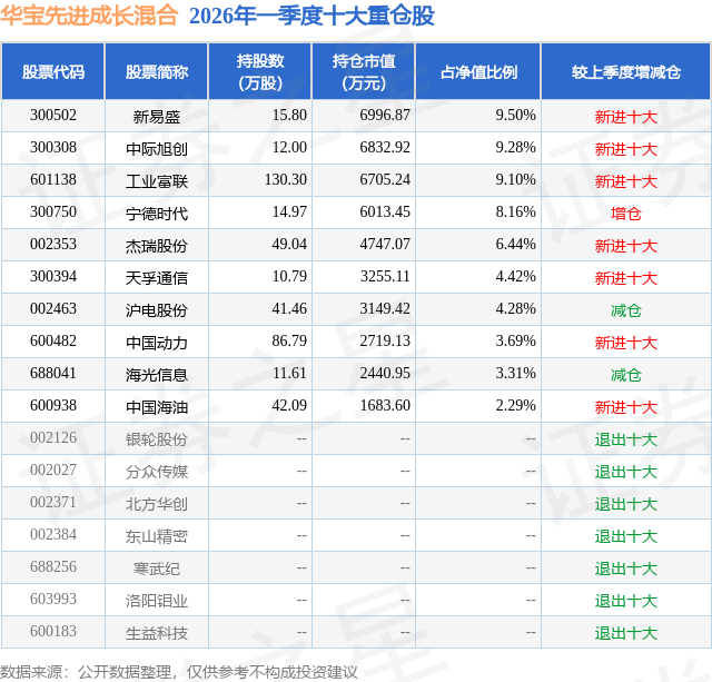 从基金规模来看,华宝先进成长混合基金2026年一季度公布的基金规模为7.37亿元,较上一期规模8.03亿元变化了-6661.36万元,环比变化了-8.29%。该基金最新一期资产配置为:股票占净值比78.85%,无债券类资产,现金占净值比21.49%。从基金持仓来看,该基金当季前十大股票仓位达60.47%,第一大重仓股为新易盛(300502),持仓占比为9.5%。
