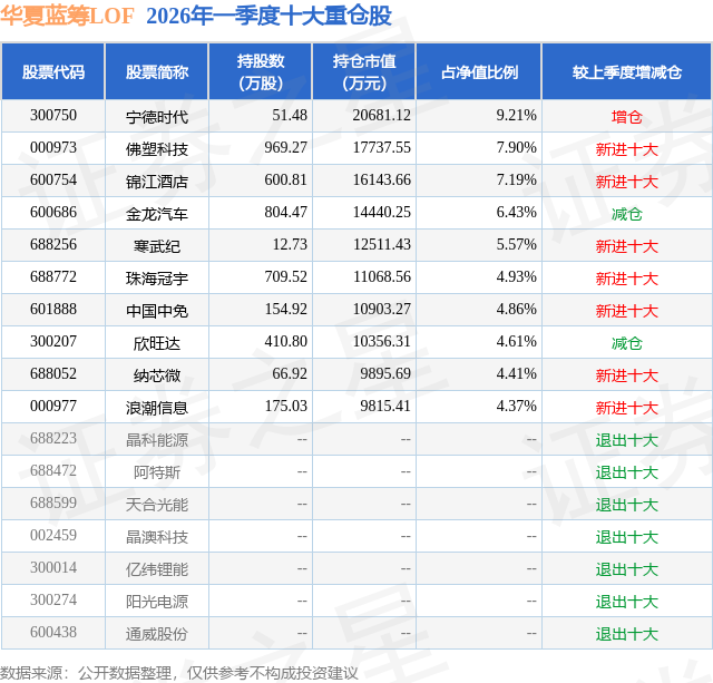 从基金规模来看,华夏蓝筹LOF基金2026年一季度公布的基金规模为19.44亿元,较上一期规模18.06亿元变化了1.38亿元,环比变化了7.66%。该基金最新一期资产配置为:股票占净值比69.62%,债券占净值比3.62%,现金占净值比27.57%。从基金持仓来看,该基金当季前十大股票仓位达59.48%,第一大重仓股为宁德时代(300750),持仓占比为9.21%。