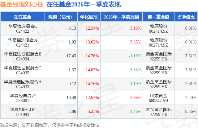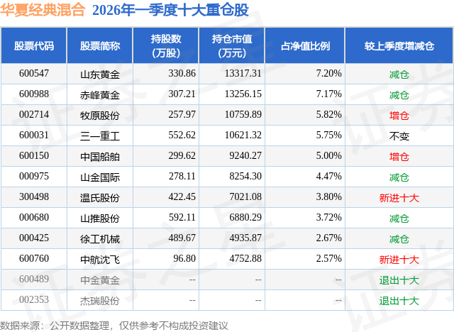 从基金规模来看,华夏经典混合基金2026年一季度公布的基金规模为18.49亿元,较上一期规模26.26亿元变化了-7.78亿元,环比变化了-29.61%。该基金最新一期资产配置为:股票占净值比59.23%,债券占净值比30.65%,现金占净值比9.93%。从基金持仓来看,该基金当季前十大股票仓位达48.17%,第一大重仓股为山东黄金(600547),持仓占比为7.2%。