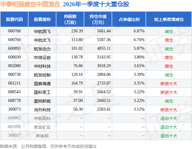 从基金规模来看,华泰柏瑞盛世中国混合基金2026年一季度公布的基金规模为8.27亿元,较上一期规模8.5亿元变化了-2366.68万元,环比变化了-2.78%。该基金最新一期资产配置为:股票占净值比81.26%,无债券类资产,现金占净值比19.06%。从基金持仓来看,该基金当季前十大股票仓位达43.21%,第一大重仓股为中航西飞(000768),持仓占比为6.87%。