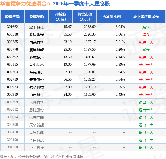 从基金规模来看,华富竞争力优选混合A基金2026年一季度公布的基金规模为3.35亿元,较上一期规模2.12亿元变化了1.23亿元,环比变化了57.81%。该基金最新一期资产配置为:股票占净值比87.42%,债券占净值比5.11%,现金占净值比7.04%。从基金持仓来看,该基金当季前十大股票仓位达45.4%,第一大重仓股为宏工科技(301662),持仓占比为6.04%。