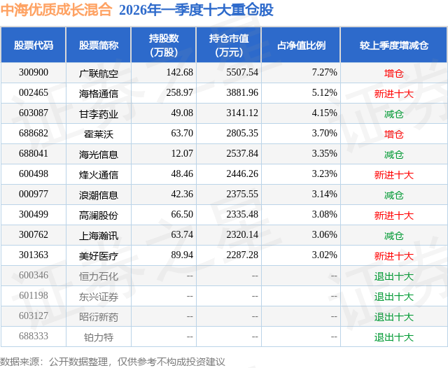 证券之星消息,日前中海优质成长混合基金公布一季报,2026年一季度最新规模7.58亿元,季度净值涨幅为-8.21%。