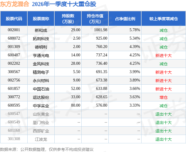 从基金规模来看,东方龙混合基金2026年一季度公布的基金规模为1.73亿元,较上一期规模1.54亿元变化了1952.44万元,环比变化了12.7%。该基金最新一期资产配置为:股票占净值比91.42%,债券占净值比5.96%,现金占净值比2.03%。从基金持仓来看,该基金当季前十大股票仓位达42.51%,第一大重仓股为新和成(002001),持仓占比为5.78%。