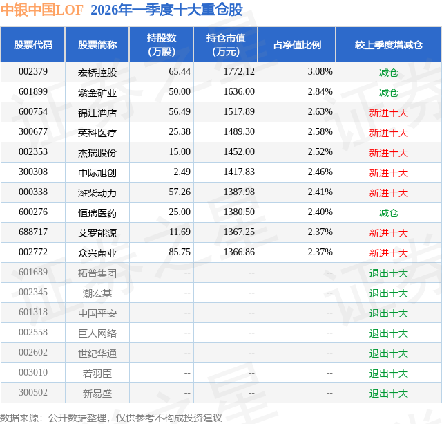 从基金规模来看,中银中国LOF基金2026年一季度公布的基金规模为5.76亿元,较上一期规模6.77亿元变化了-1.02亿元,环比变化了-14.99%。该基金最新一期资产配置为:股票占净值比88.47%,债券占净值比6.12%,现金占净值比6.76%。从基金持仓来看,该基金当季前十大股票仓位达25.66%,第一大重仓股为宏桥控股(002379),持仓占比为3.08%。
