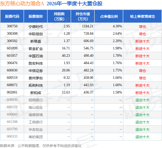 从基金规模来看,东方核心动力混合A基金2026年一季度公布的基金规模为0.24亿元,较上一期规模2105.43万元变化了266.89万元,环比变化了12.68%。该基金最新一期资产配置为:股票占净值比91.85%,债券占净值比5.7%,现金占净值比2.63%。从基金持仓来看,该基金当季前十大股票仓位达21.25%,第一大重仓股为宁德时代(300750),持仓占比为4.3%。