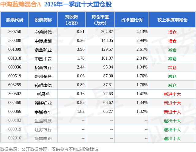 从基金规模来看,中海蓝筹混合A基金2026年一季度公布的基金规模为0.43亿元,较上一期规模3680.64万元变化了654.67万元,环比变化了17.79%。该基金最新一期资产配置为:股票占净值比72.4%,债券占净值比20.96%,现金占净值比6.88%。从基金持仓来看,该基金当季前十大股票仓位达21.36%,第一大重仓股为宁德时代(300750),持仓占比为4.13%。