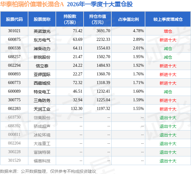从基金规模来看,华泰柏瑞价值增长混合A基金2026年一季度公布的基金规模为7.61亿元,较上一期规模5.88亿元变化了1.72亿元,环比变化了29.3%。该基金最新一期资产配置为:股票占净值比94.98%,债券占净值比0.25%,现金占净值比6.8%。从基金持仓来看,该基金当季前十大股票仓位达21.76%,第一大重仓股为英诺激光(301021),持仓占比为4.78%。