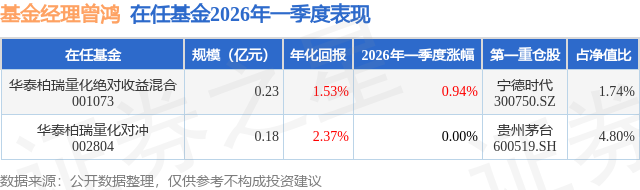 证券之星消息,日前华泰柏瑞量化绝对收益混合基金公布一季报,2026年一季度最新规模0.23亿元,季度净值涨幅为0.94%。