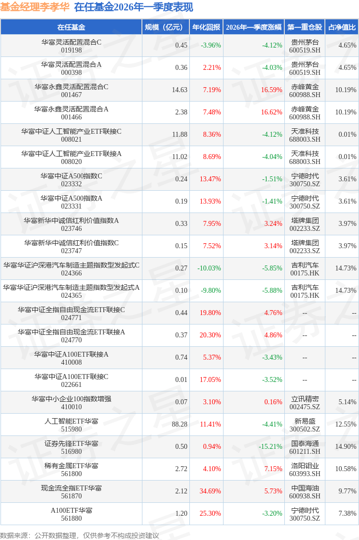 华富永鑫灵活配置混合C现任基金经理为李孝华。其中在任基金经理李孝华已从业4年又352天,2023年3月24日正式接手管理华富永鑫灵活配置混合C,任职期间累计回报为104.17%。目前还管理着22只基金产品(包括A类和C类),其中本季度表现最佳的基金为华富永鑫灵活配置混合A(001466),季度净值涨幅为16.62%。