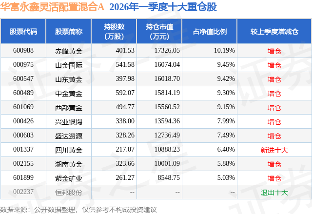 从基金规模来看,华富永鑫灵活配置混合A基金2026年一季度公布的基金规模为2.38亿元,较上一期规模151.62万元变化了2.36亿元,环比变化了15573.07%。该基金最新一期资产配置为:股票占净值比94.53%,债券占净值比3.72%,现金占净值比2.27%。从基金持仓来看,该基金当季前十大股票仓位达80.3%,第一大重仓股为赤峰黄金(600988),持仓占比为10.19%。