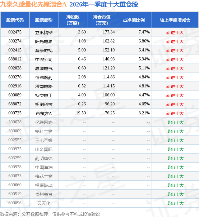 证券之星消息,日前九泰久盛量化先锋混合A基金公布一季报,2026年一季度最新规模0.24亿元,季度净值涨幅为-0.66%。