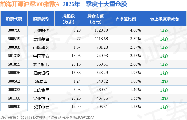 从基金规模来看,前海开源沪深300指数A基金2026年一季度公布的基金规模为2.61亿元,较上一期规模5.9亿元变化了-3.29亿元,环比变化了-55.74%。该基金最新一期资产配置为:股票占净值比92.86%,债券占净值比5.19%,现金占净值比1.71%。从基金持仓来看,该基金当季前十大股票仓位达21.58%,第一大重仓股为宁德时代(300750),持仓占比为4.0%。