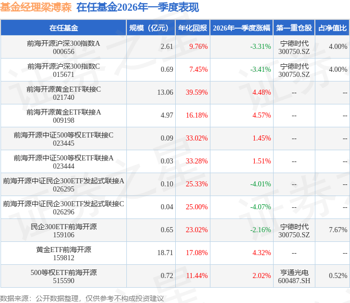证券之星消息,日前前海开源沪深300指数A基金公布一季报,2026年一季度最新规模2.61亿元,季度净值涨幅为-3.31%。