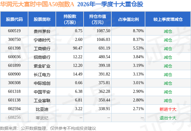 从基金规模来看,华润元大富时中国A50指数A基金2026年一季度公布的基金规模为1.19亿元,较上一期规模1.55亿元变化了-3539.44万元,环比变化了-22.9%。该基金最新一期资产配置为:股票占净值比92.7%,债券占净值比6.08%,现金占净值比1.56%。从基金持仓来看,该基金当季前十大股票仓位达44.18%,第一大重仓股为贵州茅台(600519),持仓占比为8.7%。