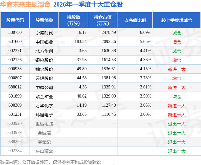 从基金规模来看,华商未来主题混合基金2026年一季度公布的基金规模为3.7亿元,较上一期规模3.74亿元变化了-417.88万元,环比变化了-1.12%。该基金最新一期资产配置为:股票占净值比90.48%,无债券类资产,现金占净值比9.57%。从基金持仓来看,该基金当季前十大股票仓位达42.24%,第一大重仓股为宁德时代(300750),持仓占比为6.69%。