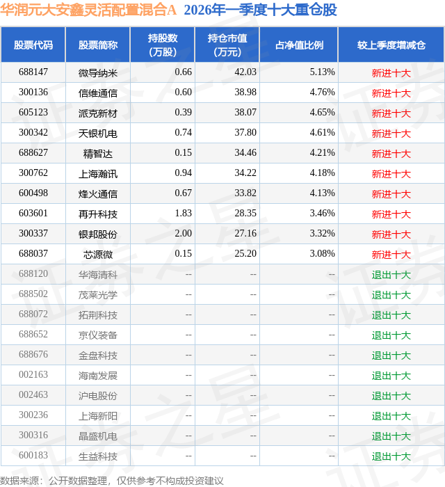 从基金规模来看,华润元大安鑫灵活配置混合A基金2026年一季度公布的基金规模为0.06亿元,较上一期规模608.68万元变化了6.7万元,环比变化了1.1%。该基金最新一期资产配置为:股票占净值比53.04%,无债券类资产,现金占净值比32.17%。从基金持仓来看,该基金当季前十大股票仓位达41.53%,第一大重仓股为微导纳米(688147),持仓占比为5.13%。