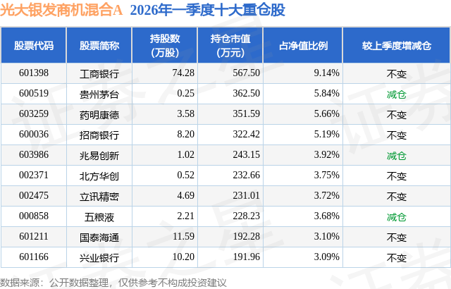 证券之星消息,日前光大银发商机混合A基金公布一季报,2026年一季度最新规模0.62亿元,季度净值涨幅为-2.85%。