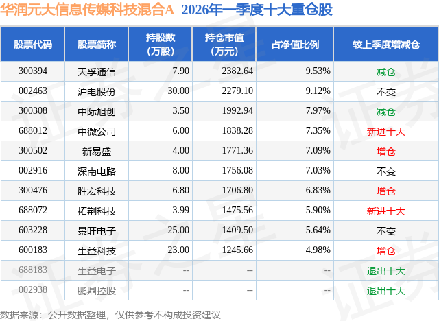 从基金规模来看,华润元大信息传媒科技混合A基金2026年一季度公布的基金规模为2.08亿元,较上一期规模2.08亿元变化了-46.17万元,环比变化了-0.22%。该基金最新一期资产配置为:股票占净值比85.69%,无债券类资产,现金占净值比17.63%。从基金持仓来看,该基金当季前十大股票仓位达71.44%,第一大重仓股为天孚通信(300394),持仓占比为9.53%。