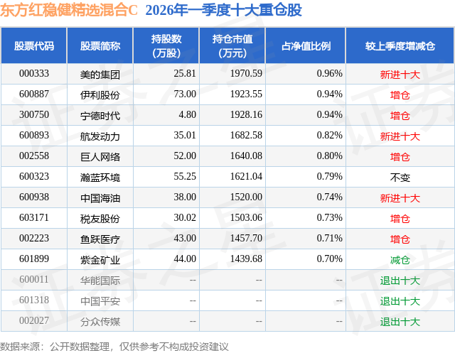 证券之星消息,日前东方红稳健精选混合C基金公布一季报,2026年一季度最新规模10.55亿元,季度净值涨幅为-0.47%。