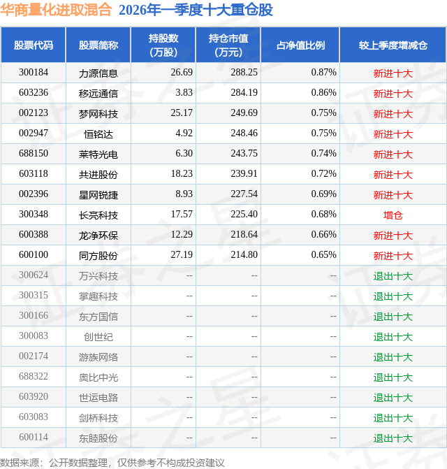 证券之星消息,日前华商量化进取混合基金公布一季报,2026年一季度最新规模3.31亿元,季度净值涨幅为0.58%。