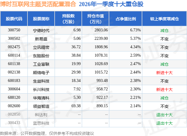 从基金规模来看,博时互联网主题灵活配置混合基金2026年一季度公布的基金规模为4.17亿元,较上一期规模3.66亿元变化了5078.52万元,环比变化了13.88%。该基金最新一期资产配置为:股票占净值比82.55%,无债券类资产,现金占净值比18.77%。从基金持仓来看,该基金当季前十大股票仓位达32.97%,第一大重仓股为宁德时代(300750),持仓占比为6.73%。