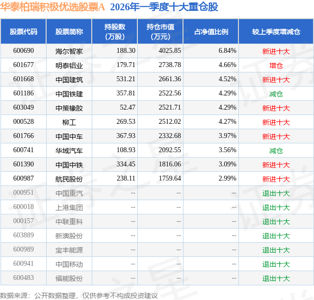 从基金规模来看,华泰柏瑞积极优选股票A基金2026年一季度公布的基金规模为1.63亿元,较上一期规模3.95亿元变化了-2.32亿元,环比变化了-58.74%。该基金最新一期资产配置为:股票占净值比79.84%,无债券类资产,现金占净值比17.68%。从基金持仓来看,该基金当季前十大股票仓位达42.48%,第一大重仓股为海尔智家(600690),持仓占比为6.84%。