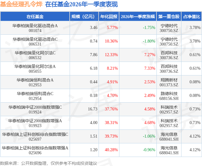证券之星消息,日前华泰柏瑞量化驱动混合A基金公布一季报,2026年一季度最新规模3.46亿元,季度净值涨幅为-1.75%。