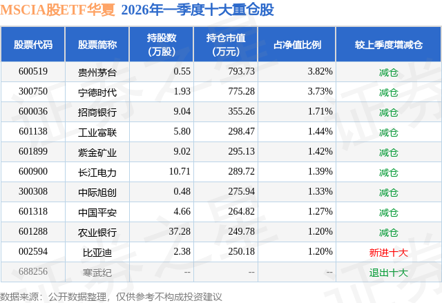 从基金规模来看,MSCIA股ETF华夏基金2026年一季度公布的基金规模为2.08亿元,较上一期规模2.34亿元变化了-2634.76万元,环比变化了-11.25%。该基金最新一期资产配置为:股票占净值比98.6%,无债券类资产,现金占净值比1.25%。从基金持仓来看,该基金当季前十大股票仓位达18.51%,第一大重仓股为贵州茅台(600519),持仓占比为3.82%。