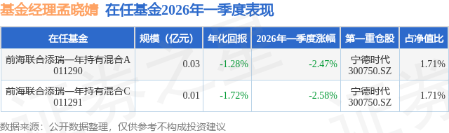 证券之星消息,日前前海联合添瑞一年持有混合A基金公布一季报,2026年一季度最新规模0.03亿元,季度净值涨幅为-2.47%。