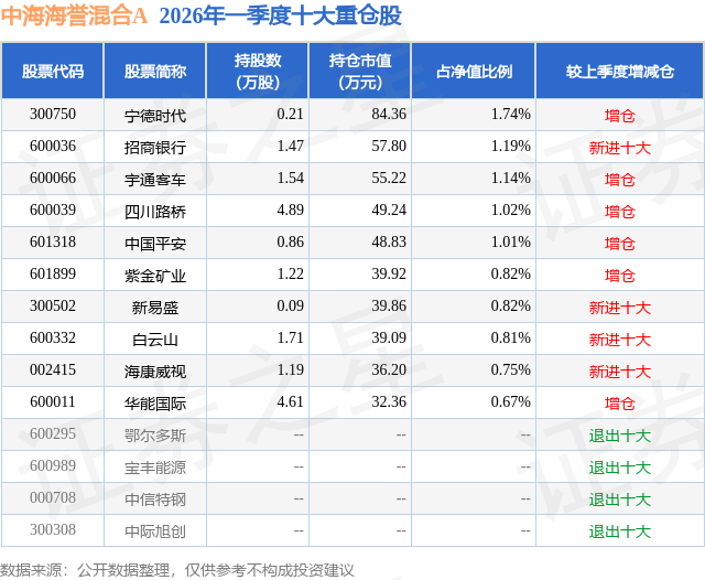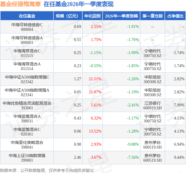 证券之星消息,日前中海海誉混合A基金公布一季报,2026年一季度最新规模0.23亿元,季度净值涨幅为-1.85%。