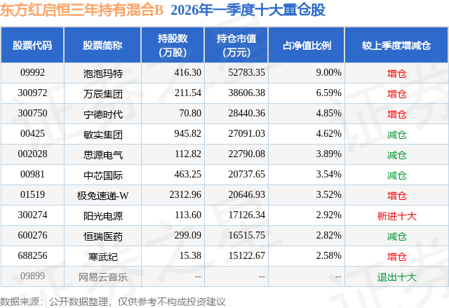 从基金规模来看,东方红启恒三年持有混合B基金2026年一季度公布的基金规模为52.7亿元,较上一期规模78.45亿元变化了-25.75亿元,环比变化了-32.82%。该基金最新一期资产配置为:股票占净值比94.35%,无债券类资产,现金占净值比5.97%。从基金持仓来看,该基金当季前十大股票仓位达44.33%,第一大重仓股为泡泡玛特(09992),持仓占比为9.0%。