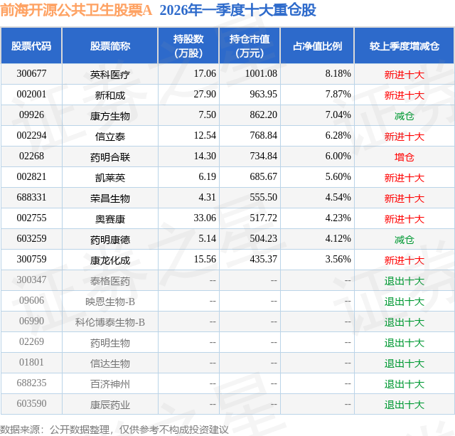 从基金规模来看,前海开源公共卫生股票A基金2026年一季度公布的基金规模为0.77亿元,较上一期规模6725.3万元变化了930.02万元,环比变化了13.83%。该基金最新一期资产配置为:股票占净值比83.38%,无债券类资产,现金占净值比11.23%。从基金持仓来看,该基金当季前十大股票仓位达57.42%,第一大重仓股为英科医疗(300677),持仓占比为8.18%。