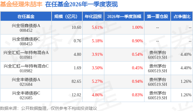 从基金规模来看,兴全汇虹一年持有混合A基金2026年一季度公布的基金规模为4.8亿元,较上一期规模10.95亿元变化了-6.15亿元,环比变化了-56.17%。该基金最新一期资产配置为:股票占净值比28.34%,债券占净值比94.58%,现金占净值比3.86%。从基金持仓来看,该基金当季前十大股票仓位达18.97%,第一大重仓股为贵州茅台(600519),持仓占比为4.4%。