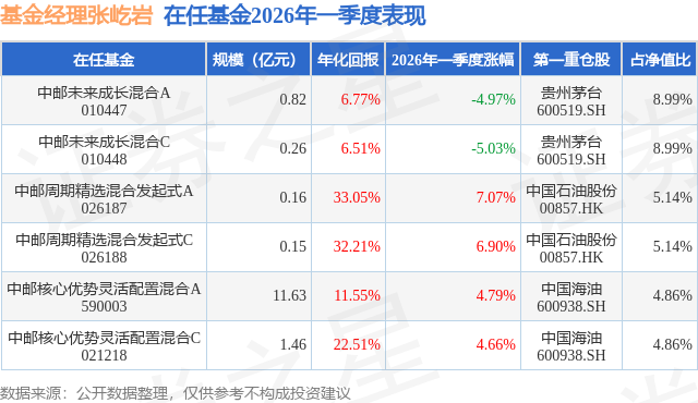 中邮未来成长混合A现任基金经理为张屹岩,本季度增聘基金经理张屹岩,近期离任的基金经理为金振振。其中在任基金经理张屹岩已从业2年又109天,2026年2月11日正式接手管理中邮未来成长混合A,任职期间累计回报为-7.6%。目前还管理着6只基金产品(包括A类和C类),其中本季度表现最佳的基金为中邮周期精选混合发起式A(026187),季度净值涨幅为7.07%。