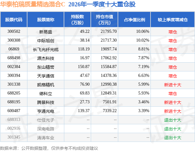 从基金规模来看,华泰柏瑞质量精选混合C基金2026年一季度公布的基金规模为13.2亿元,较上一期规模357.83万元变化了13.17亿元,环比变化了36800.37%。该基金最新一期资产配置为:股票占净值比90.4%,无债券类资产,现金占净值比11.29%。从基金持仓来看,该基金当季前十大股票仓位达69.35%,第一大重仓股为新易盛(300502),持仓占比为10.06%。