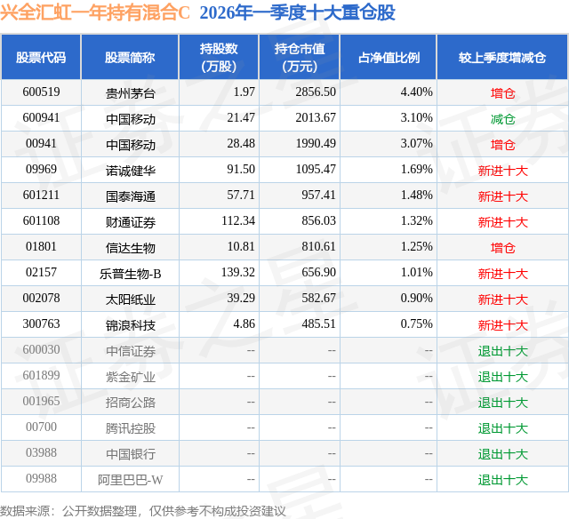从基金规模来看,兴全汇虹一年持有混合C基金2026年一季度公布的基金规模为1.69亿元,较上一期规模4.67亿元变化了-2.98亿元,环比变化了-63.82%。该基金最新一期资产配置为:股票占净值比28.34%,债券占净值比94.58%,现金占净值比3.86%。从基金持仓来看,该基金当季前十大股票仓位达18.97%,第一大重仓股为贵州茅台(600519),持仓占比为4.4%。