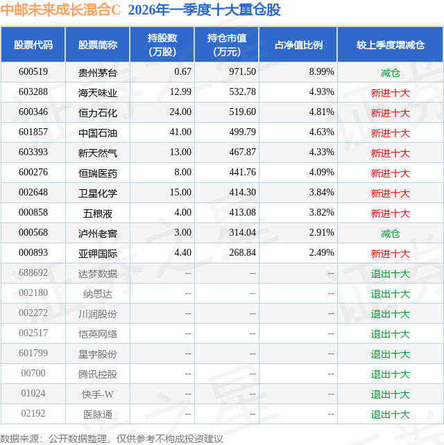 从基金规模来看,中邮未来成长混合C基金2026年一季度公布的基金规模为0.26亿元,较上一期规模4458.57万元变化了-1896.38万元,环比变化了-42.53%。该基金最新一期资产配置为:股票占净值比72.31%,债券占净值比0.75%,现金占净值比12.79%。从基金持仓来看,该基金当季前十大股票仓位达44.84%,第一大重仓股为贵州茅台(600519),持仓占比为8.99%。