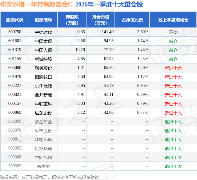 从基金规模来看,华安添禧一年持有期混合C基金2026年一季度公布的基金规模为0.03亿元,较上一期规模698.98万元变化了-442.87万元,环比变化了-63.36%。该基金最新一期资产配置为:股票占净值比24.16%,债券占净值比68.61%,现金占净值比8.02%。从基金持仓来看,该基金当季前十大股票仓位达12.69%,第一大重仓股为宁德时代(300750),持仓占比为2.6%。